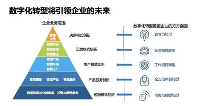 数字化转型为什么会引领企业的未来?以制造业企业为例,其业务范围呈现金字塔结构,最顶层是智能决策,强调实现决策模式创新;